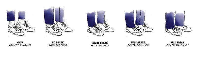 Similar to fit, getting the length of your pants just right is a common problem for both men and women. For men, we usually speak in terms of “break” in the pants. The chart below shows the range of typical breaks. For some guys, they still get stumped about which break to choose, so here are a few tips: